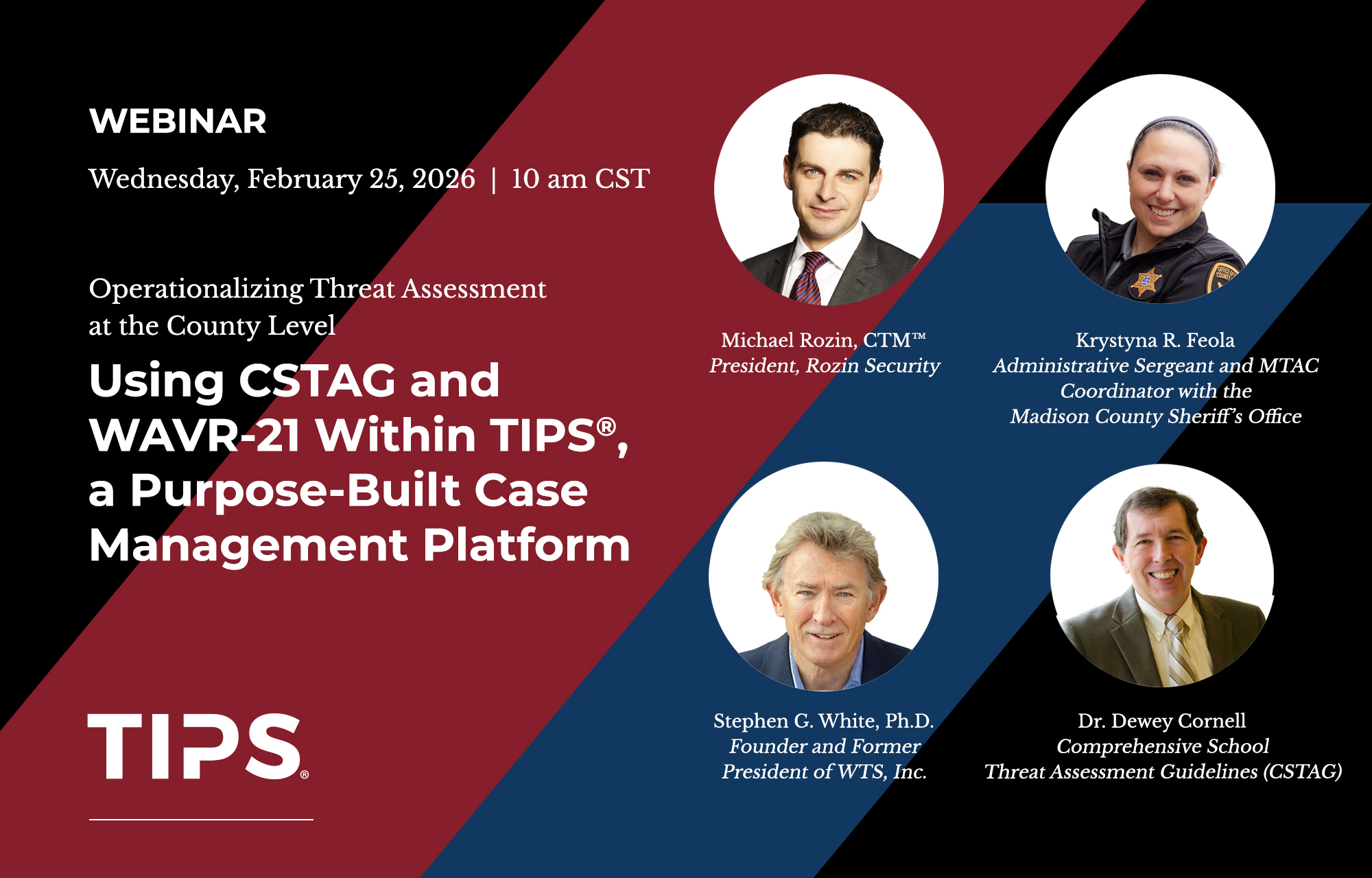 “When it comes to selecting a case management platform for our behavioral threat assessments, Rozin Security’s TIPS® platform stands out as the undisputed gold standard, delivering unparalleled innovation, functionality, and flexibility. TIPS® offers seamless access to an extensive library of Structured Professional judgment tools, empowering our team to make informed, evidence-based decisions with confidence. What truly sets TIPS® apart is its remarkable customizability, allowing us to tailor the platform to our unique operational needs with ease.